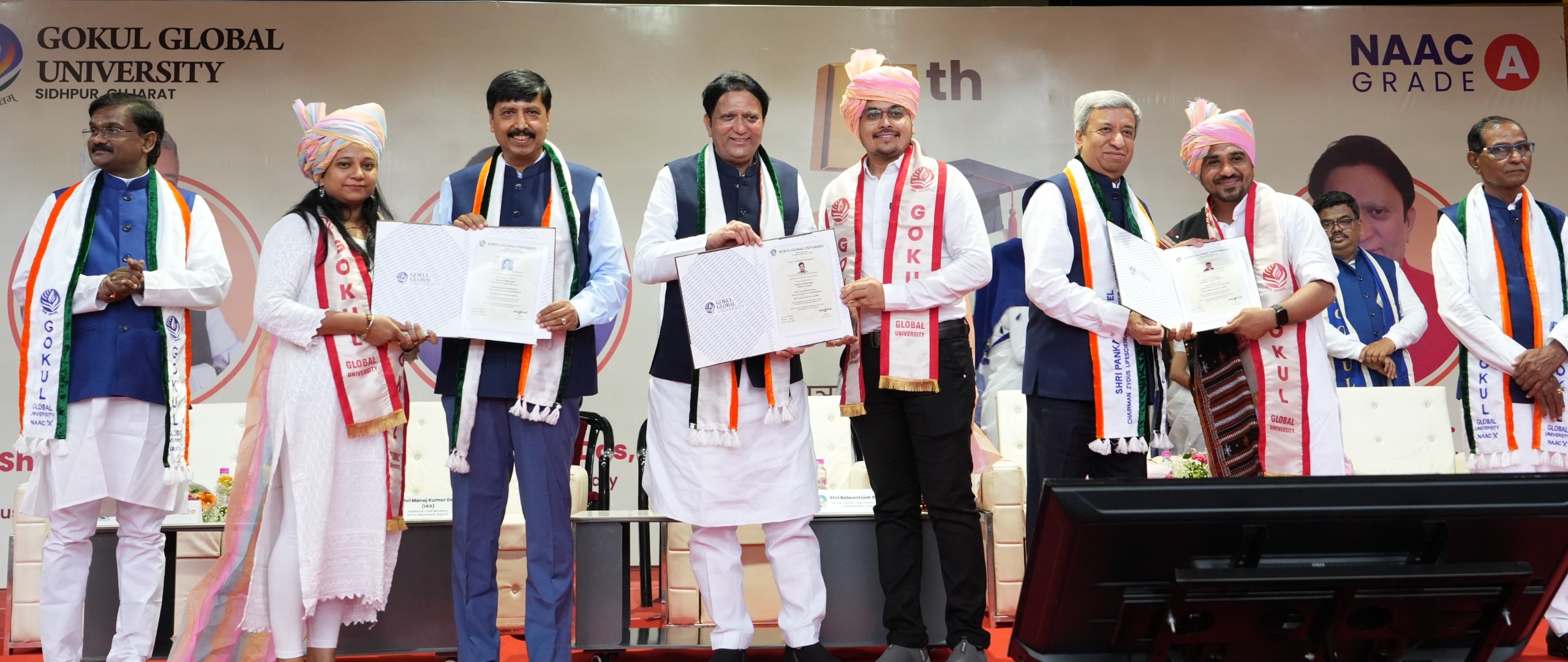સિદ્ધપુર(પાટણ): રાજ્યના કેબિનેટ મંત્રી અને ગોકુલ ગ્લોબલ યુનિવર્સિટીના ચેરમેન શ્રી બલવંતસિંહ રાજપૂત, ઝાયડસ હોસ્પિટલ્સના ચેરમેન અને IIM-A ના  પ્રમુખ અને પદ્મ ભૂષણ શ્રી પંકજભાઈ પટેલ, ગુજરાત સરકારના અધિક મુખ્ય સચિવ શ્રી મનોજ કુમાર દાસ( IAS) ની ગરિમામય ઉપસ્થિતિમાં આજે ગોકુલ ગ્લોબલ યુનિવર્સિટીનો પાંચમો પદવીદાન સમારંભ ગર્વભેર ઉજવવામાં આવ્યો હતો. વિદ્યાર્થીઓની શૈક્ષણિક યાત્રામાં એક મહત્વપૂર્ણ સીમાચિહ્નરૂપ એક જીવંત અને યાદગાર સમારોહમાં મંત્રી શ્રી અને મંચસ્થ મહાનુભાવોના હસ્તે ૧૯ પીએચ.ડી. ડિગ્રી, ૩૭ ગોલ્ડ મેડલ અને ૩૬ સિલ્વર મેડલ ઉત્કૃષ્ટ શૈક્ષણિક પ્રદર્શન માટે વિદ્યાર્થીઓને ડિગ્રી પ્રમાણપત્ર આપી સન્માનિત કરવામાં આવ્યા હતા. પદવીદાન સમારોહ અંતર્ગત કુલ ૧૬૬૦ ડિગ્રી એનાયત કરવામાં આવી હતી.